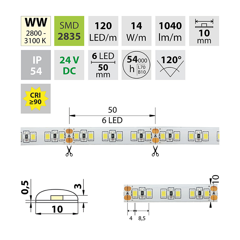 LED pásek SMD2835, 2800-3100K (teple bílý WW), 14W, 120LED, 1040lm/m, segment 100mm, 6LED/segment, IP54, DC 24V, životnost 54000h, šíře 10mm, bílý PCB pásek, max. délka pásku při jednostranném zapojení: 8m, opatřen samolepící páskou 3M, UV stabilní. Balení 5m.