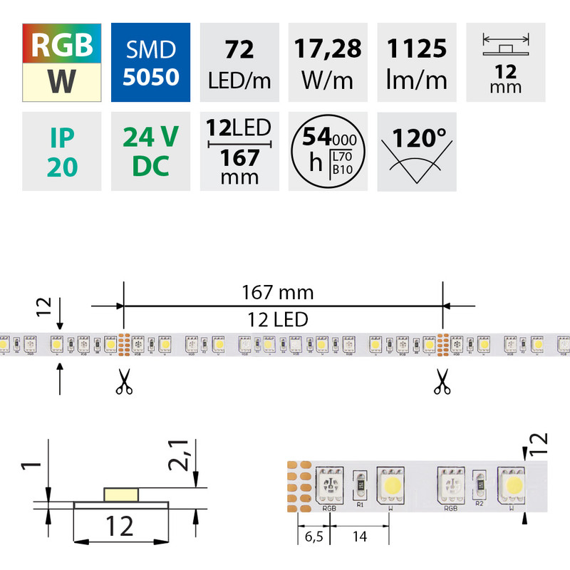 LED pásek SMD5050 RGB+CW, 72LED/m, 17,2W/m, 1125lm/m, IP20, DC 24V, 12mm, 5m