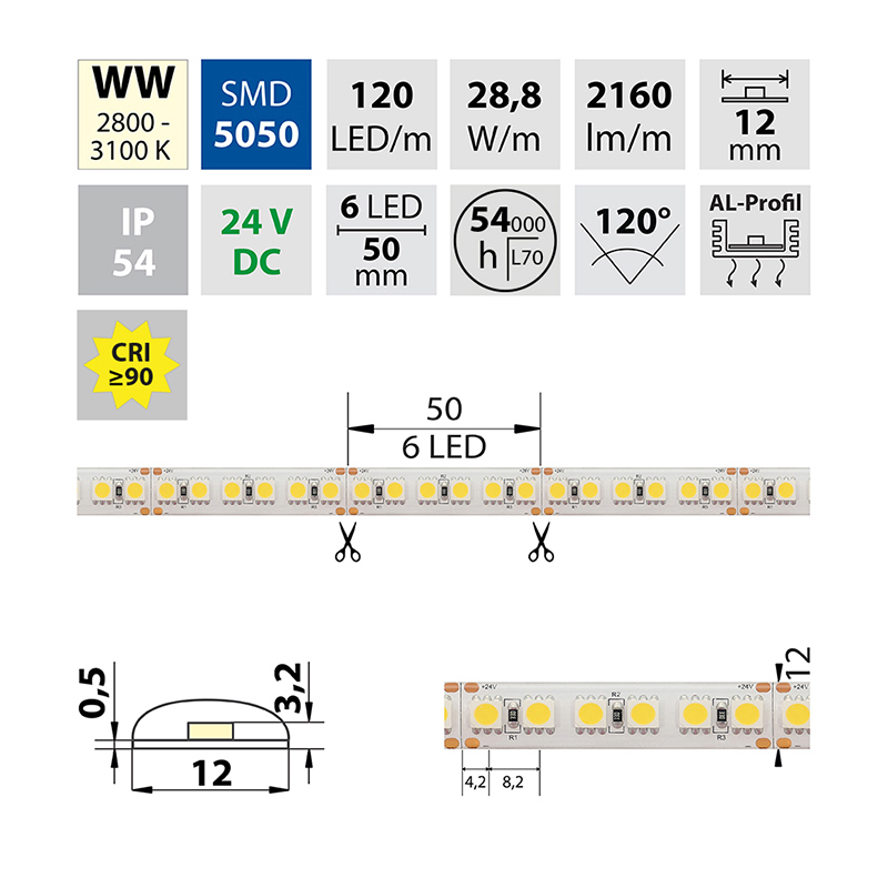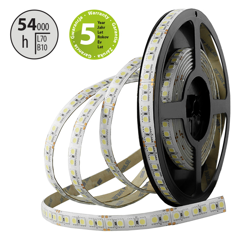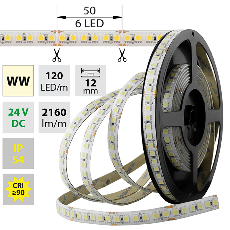 LED pásek SMD5050 WW, 120LED/m, 28,8W/m, 2160lm/m, IP54, DC 24V, 12mm, 5m