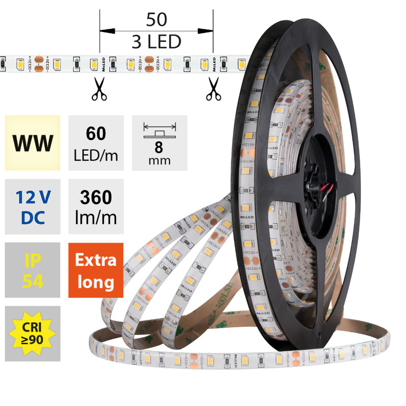 LED pásek SMD2835 WW, 60LED/m, 4,8W/m, DC 12V, 360lm/m, CRI90, IP54, 8mm, 5m