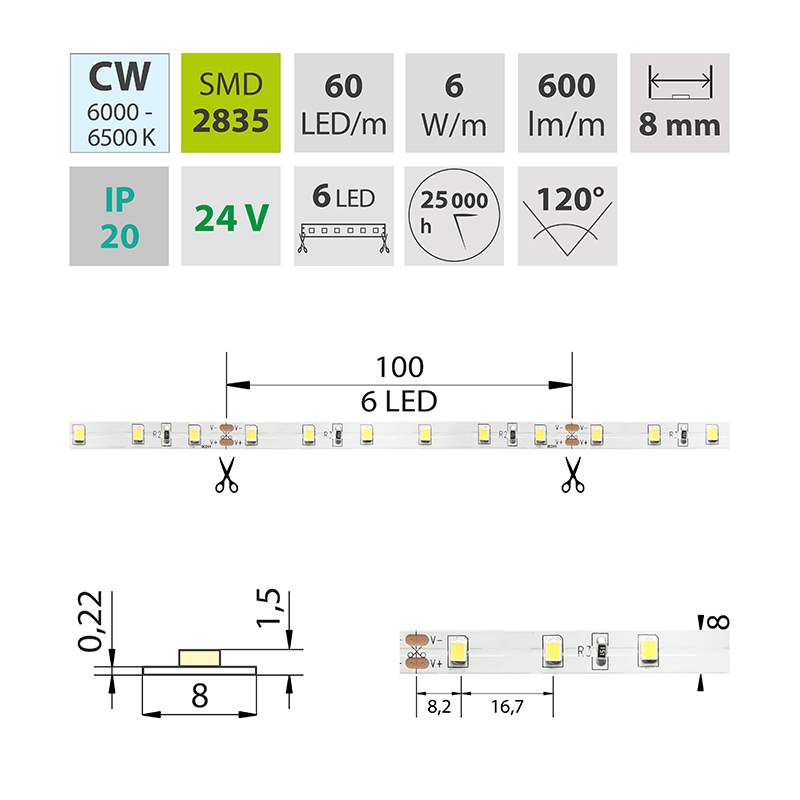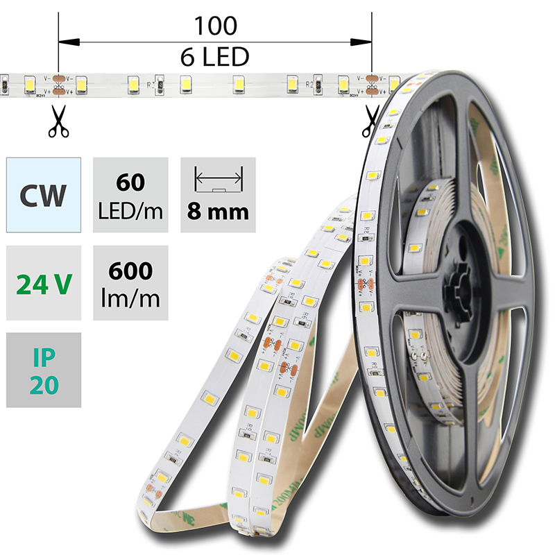 LED pásek SMD2835 studeně bílý, 60LED/m, IP20, DC 24V, 8mm, 30m