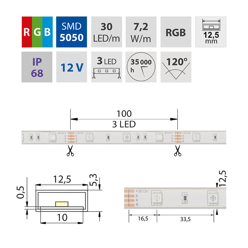 LED pásek SMD5050 RGB, 30LED/m, IP68, DC 12V, 12,5mm, 5m