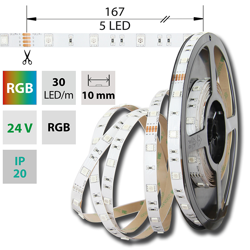 LED pásek SMD5050 RGB, 30LED/m, 8,5W/m, DC24V, 280lm/m, IP20, 10mm, 50m