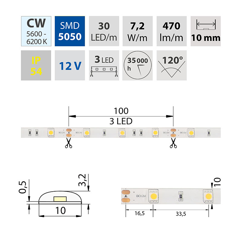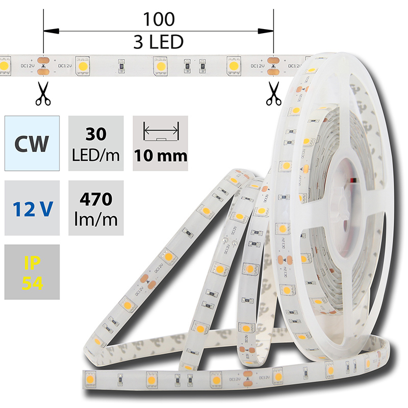LED pásek SMD5050 CW, 30LED/m, 7,2W/m, 470lm/m, IP54, DC 12V, 10mm, 5m