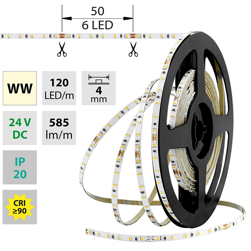LED pásek SMD2216 WW, 120LED/m, 7,2W/m, DC 24V, 585lm/m, CRI90, IP20, 4mm, 5m