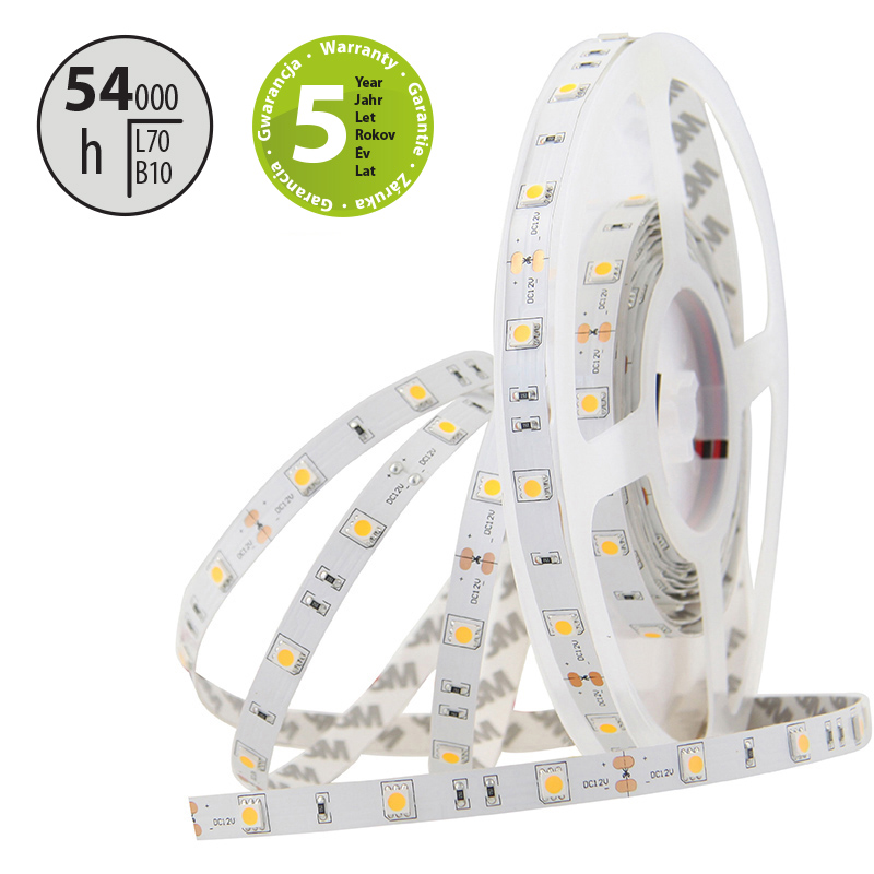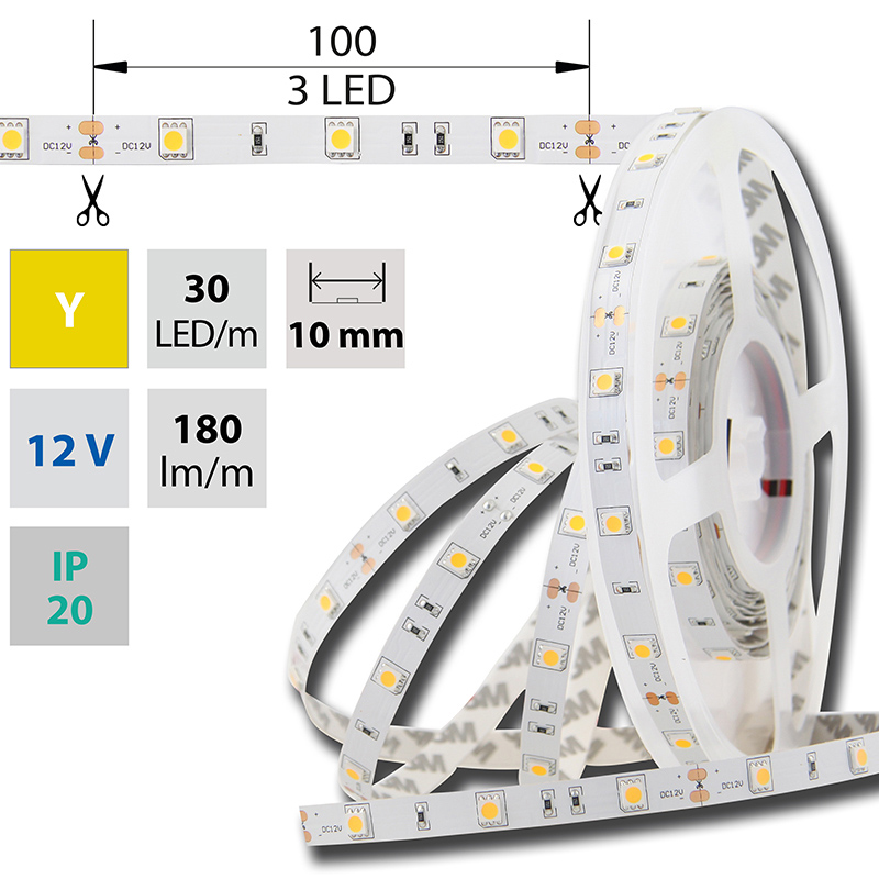 LED pásek SMD5050 Y, 30LED/m, 7,2W/m, 180lm/m, IP20, DC 12V, 10mm, 5m