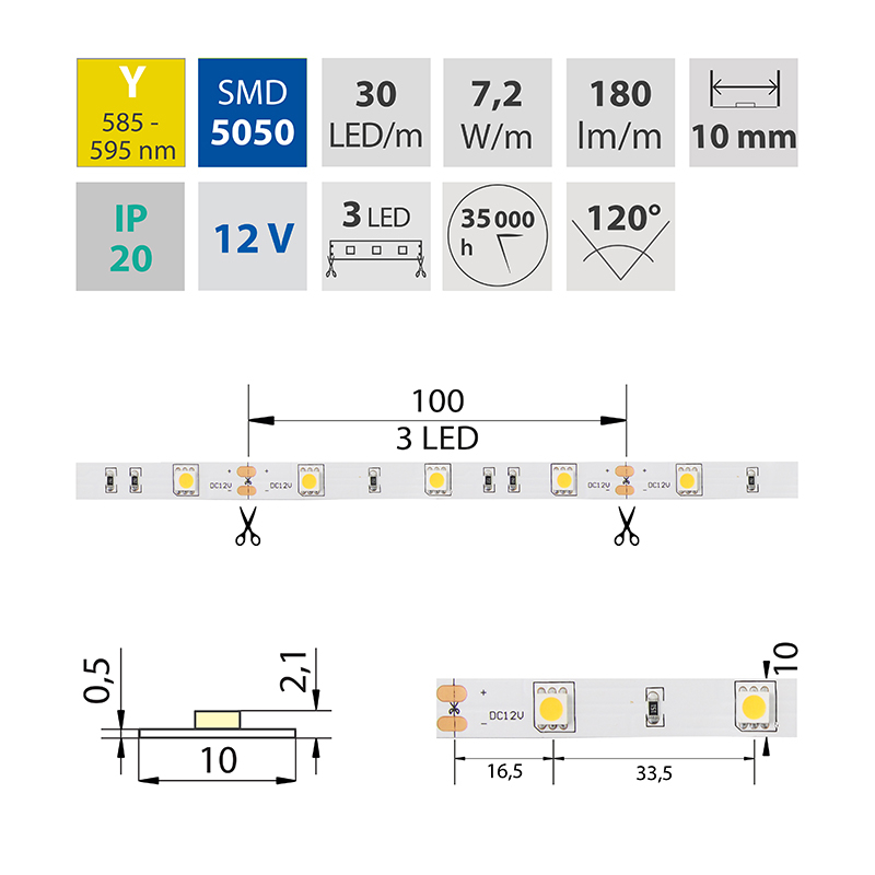 LED pásek SMD5050, žlutá (590nm), 7,2W, 30LED, 180lm/m, segment 100mm, 3LED/segment, IP20, DC 12V, životnost 54000h, šíře 10mm, bílý PCB pásek, max. délka pásku při jednostranném zapojení: 5m, opatřen samolepící páskou 3M.