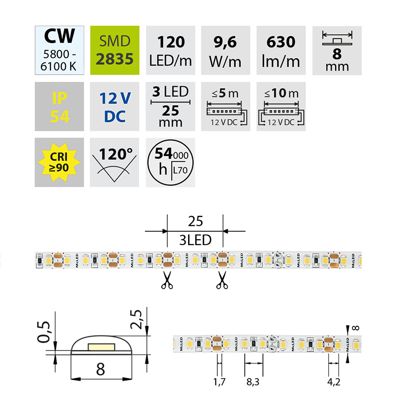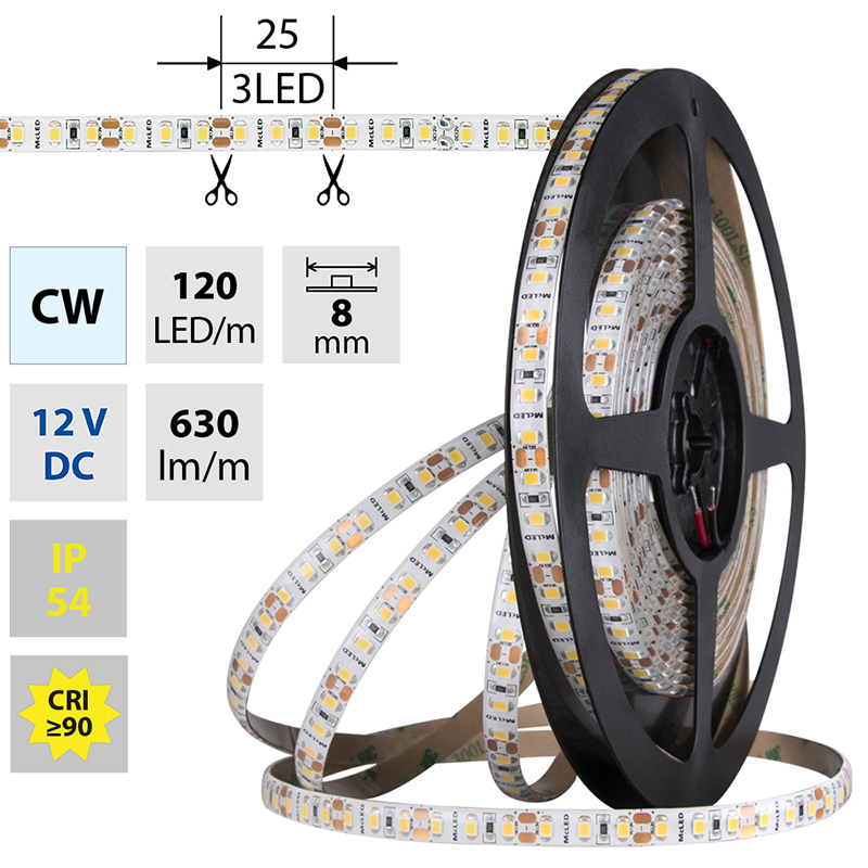 LED pásek SMD2835 CW, 120LED/m, 9,6W/m, DC 12V, 630lm/m, CRI90, IP54, 8mm, 5m