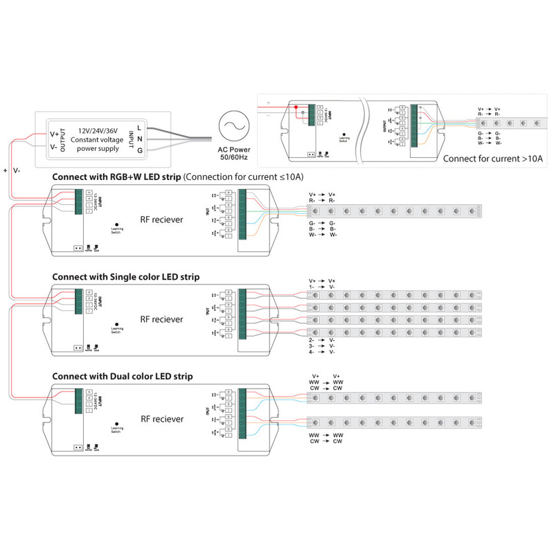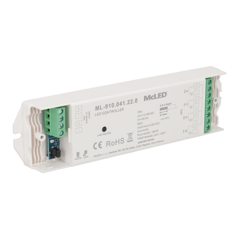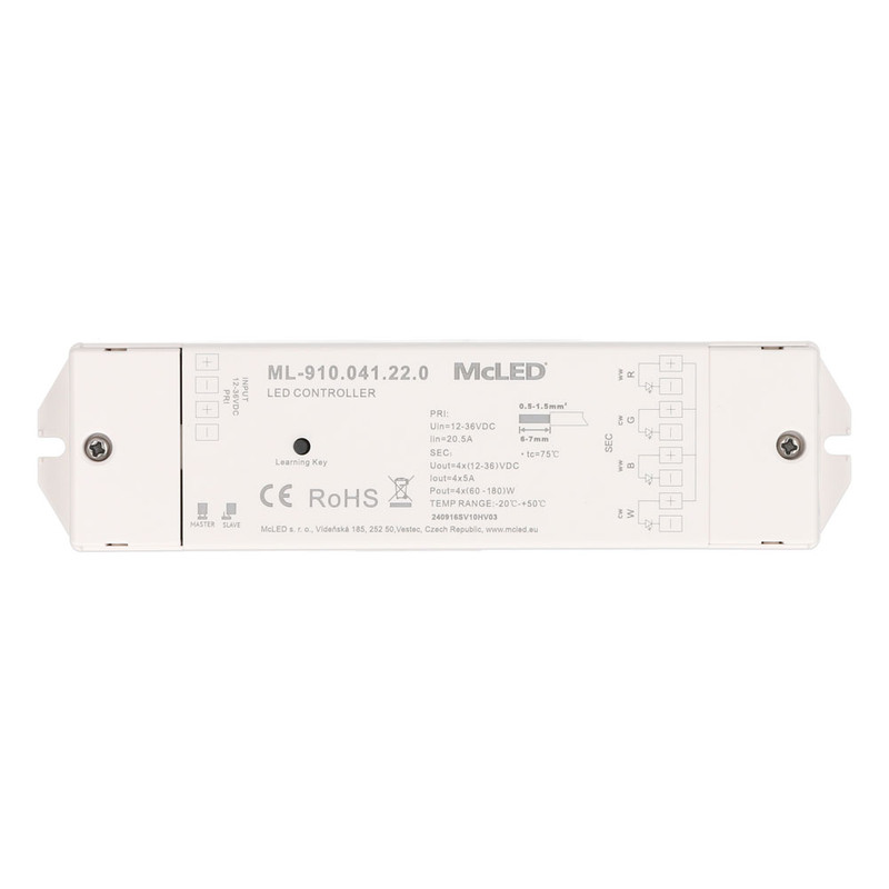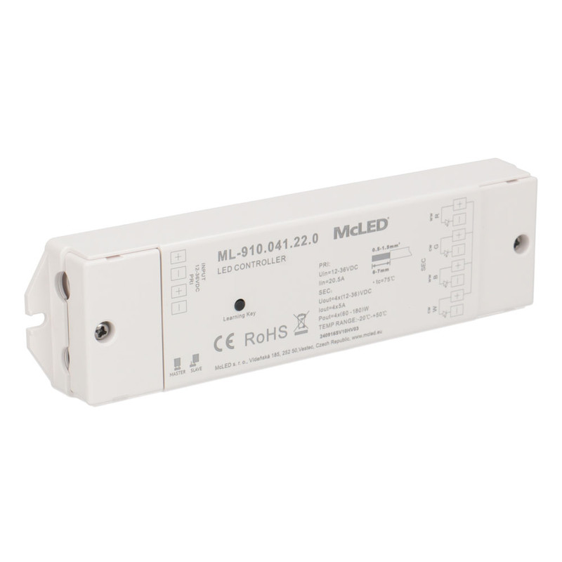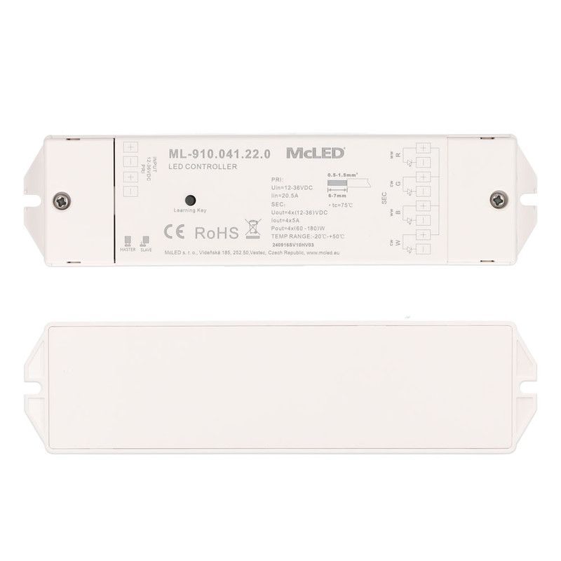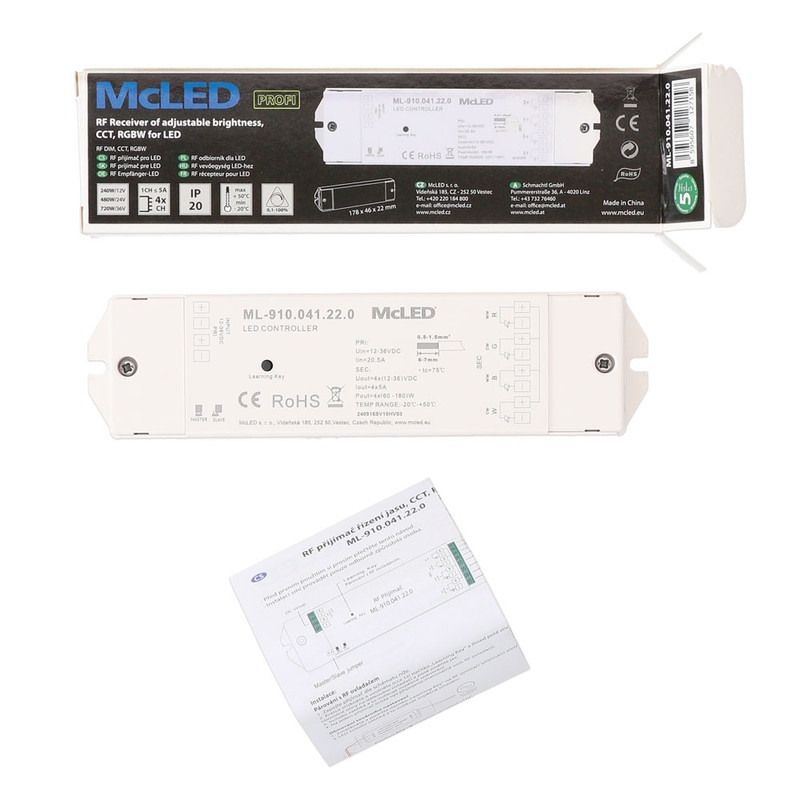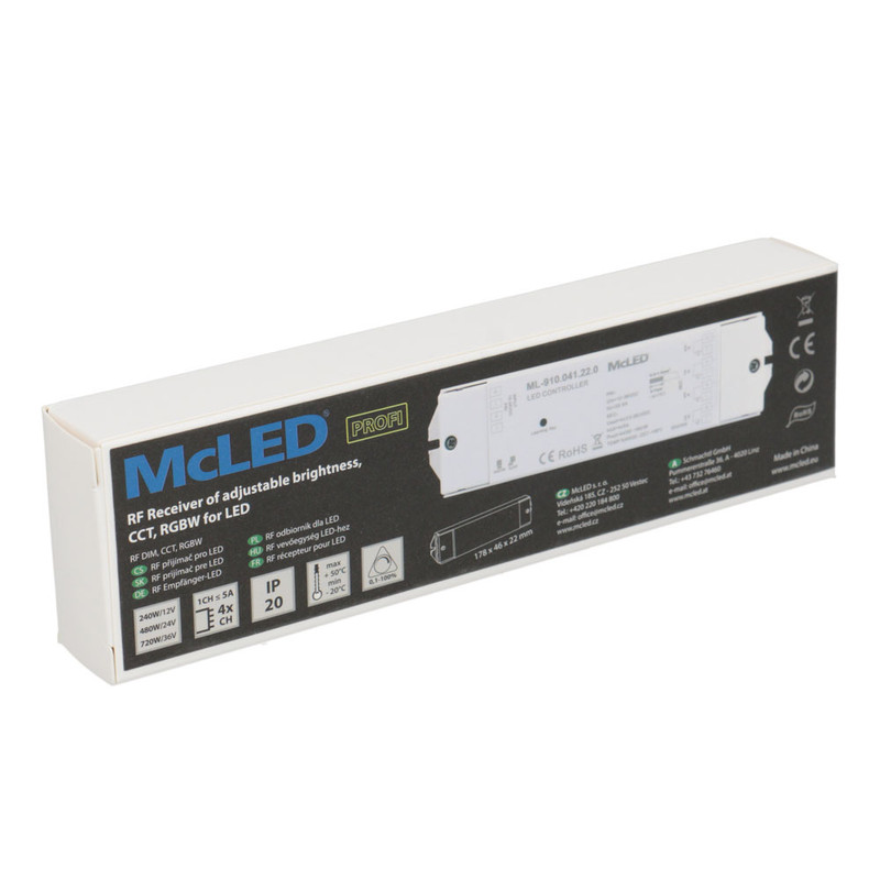 RF přijímač - řízení jasu, CCT, RGBW, 4 kanály, 4x 5A, 12-36V