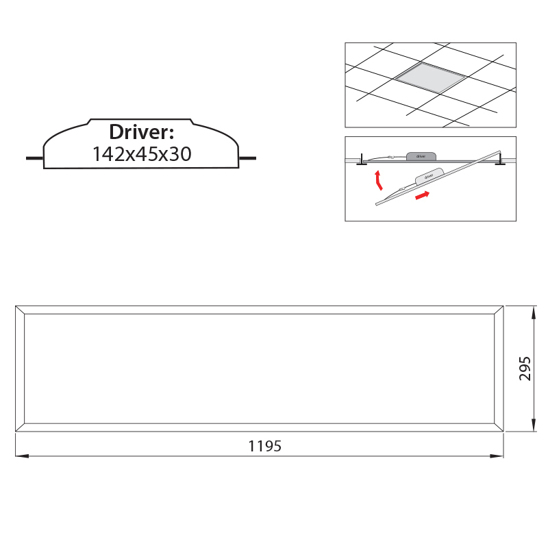 LED panelové svítidlo 36W (ekvivalent 2x36W T8 úspora až 46%) stříbrný rám, 230V, IP20, 4000K-neutrální bílá, světelný tok 3490lm, vyzařovací úhel 120°, Ra>80, životnost až 50.000h, rozměry 295x1195x10, materiál hliník/plast, nestmívatelné, PF>0,9
