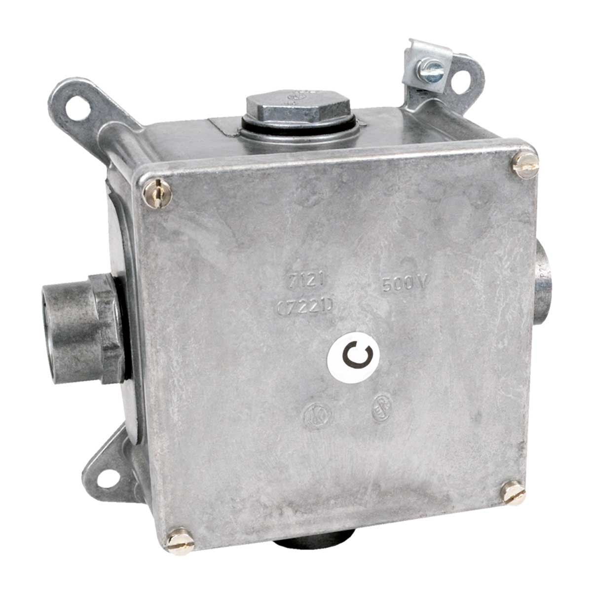 7121 B - KRABICE S IP KRYTÍM KOVOVÁ, konfigurace P21, barva KOV, balení - 1/12 ks - krabice pro rozvody s ocelovými závitovanými nebo kovovými ohebnými trubkami, 3 vývodky a jedna zátka rovnoměrně rozloženy na bocích krabice, svorkovnice není součástí krabice, osazena svorka pro provedení instalace v sítích TNS