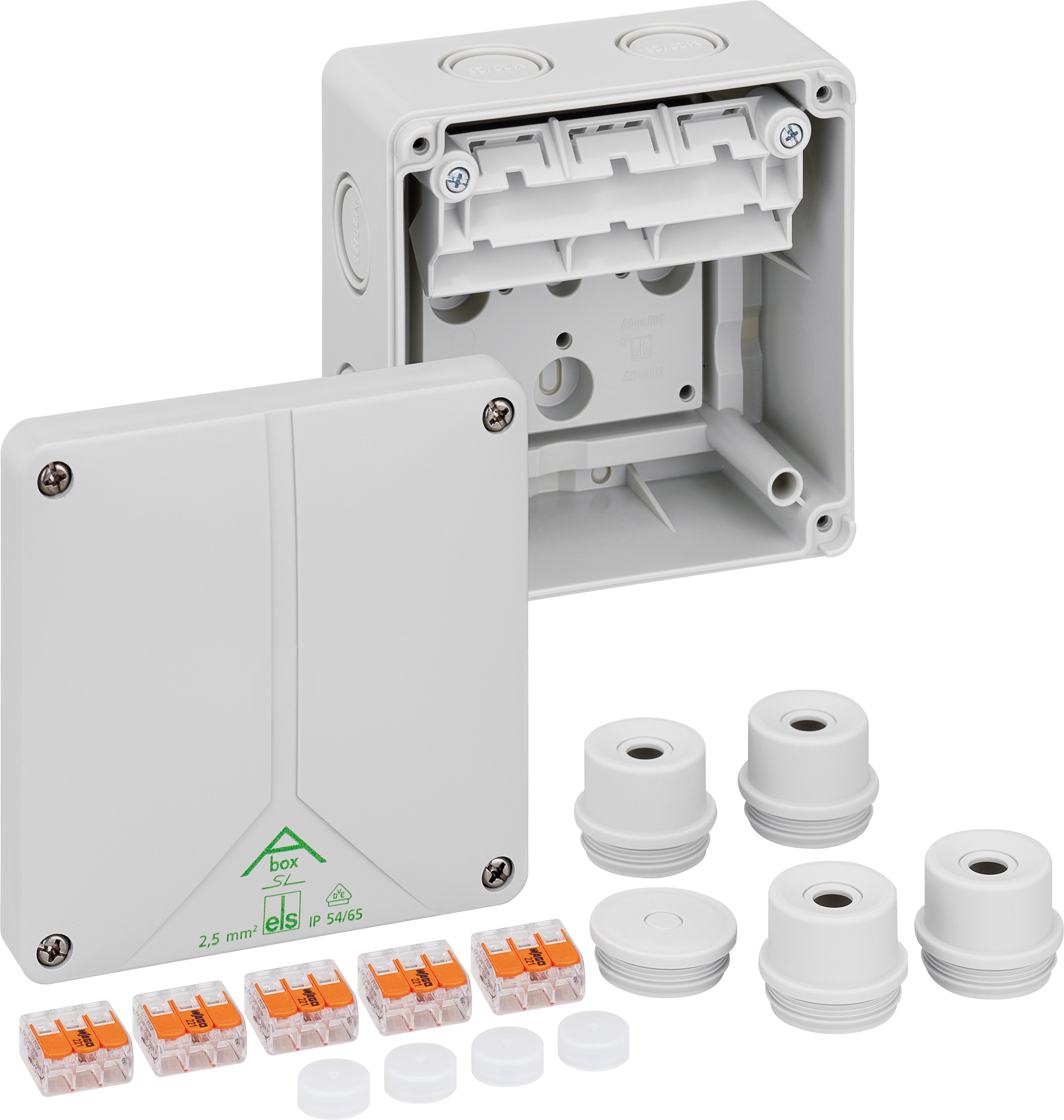 Rozbočovací krabice, se stupněm krytí IP54/IP65, Jmenovitý průřez 4mm², Ui=450 V AC, Certifikováno VDE (DIN EN 60670-1/-22 (VDE 0606-1/-22)), Vyrážecí membrány, M20/M25, (2 prolis ze zadu, 7 vývodek z boku), Vnitřní místa pro připevnění, s bezšroubovými svorkami pro standardní instalace ve vnitřním prostoru, šedá, s 5-ti vysoko položenými, bezšroubovými 3-vodičovými svorkami Wago 221-413, max. jmenovitý průřez podle DIN EN 60998: 4mm², při proudové zatížitelnosti 24 A, svorkovatelné průřezy na pól: 3 x 0,2 až 4mm² pevné a 3 x 0,14 až 4,0mm² flexibilní