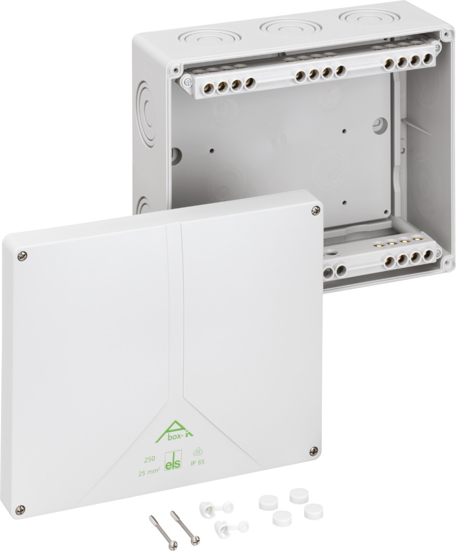Rozbočovací krabice, druh krytí IP65, max. 25², rázová houževnatost IK08, třída ochrany II, Ui 690V AC, DLG, DNV, VDE, bez obsahu halogenů
