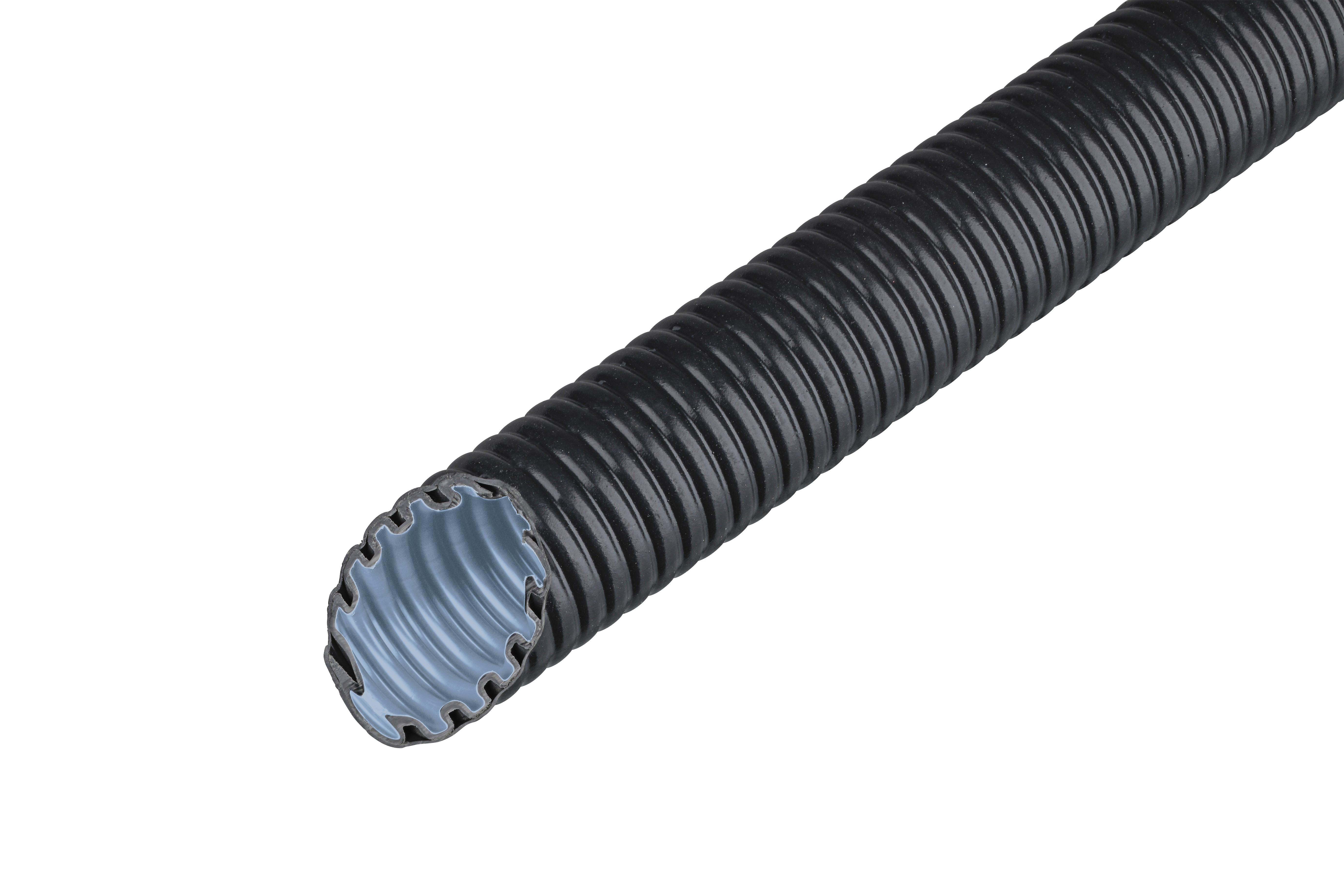 FFKuS-ES-F-UV Highspeed je vysoce odolná plastová ohebná trubka z modifikovaného PVC s vysoce kluznou vnitřní vrstvou, s plastovým pláštěm, v černé barvě, která brání šíření plamene. Tato plastová ohebná trubka se používá pro instalaci venku, do betonu a do půdy. Hlavní výhodou je vysoká pevnost v tlaku a vysoce kluzná vnitřní vrstva. Tato trubka umožňuje bezproblémové protahování kabelů a vodičů delšími úseky.Jediná ohebná plastová vlnitá trubka s vysokou pevností v tlaku.