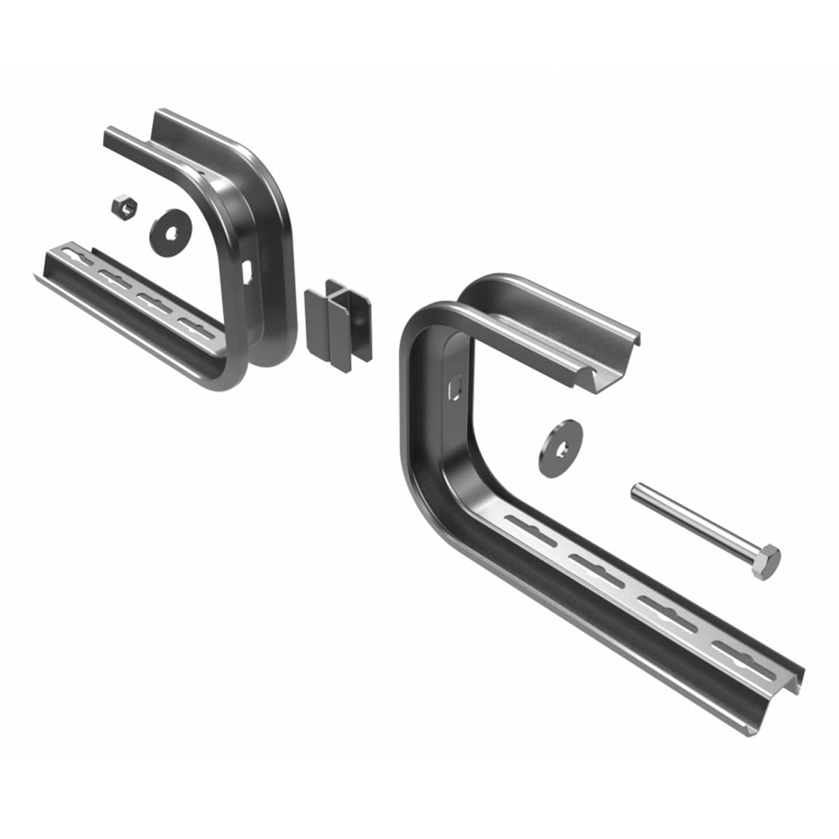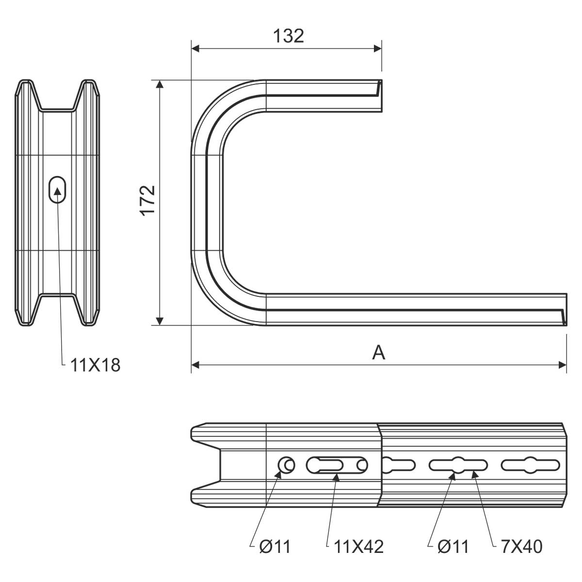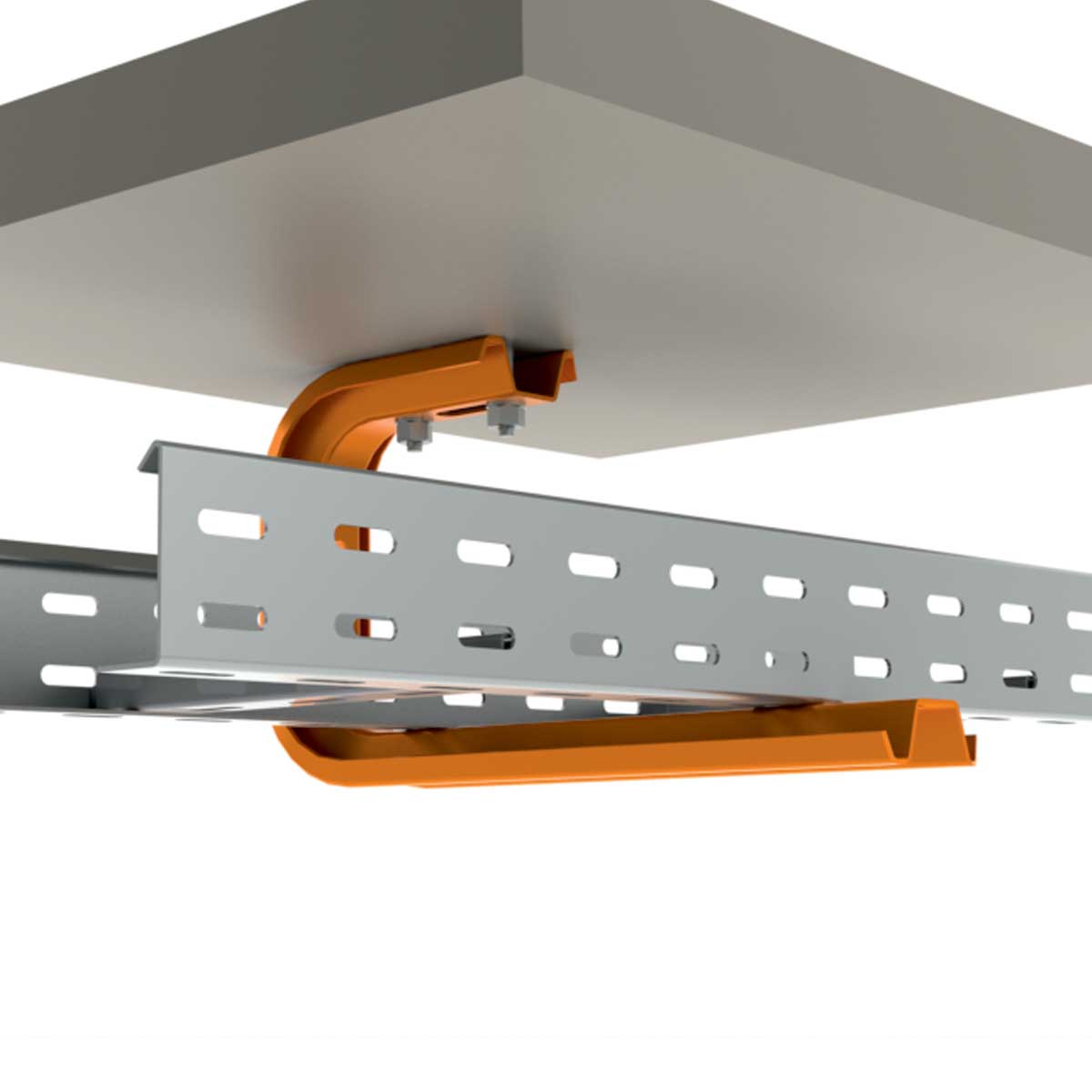 Třmen závěsný tvaru C pro montáž kabelového nosného systému na stěnu nebo strop, určen pro kabelové trasy šíře 200 mm, povrchová úprava sendzimir