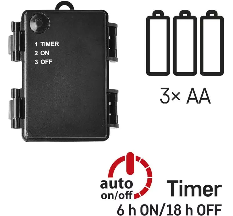 Vánoční bateriové řetězy CLASSIC jsou jasnou volbou pro vytvoření útulné atmosféry při nejrůznějších svátečních příležitostech. Oceníte je zejména v případech, kdy není žádoucí, aby byl celkový dojem z dekorace rušen přívodním kabelem nebo není dostupný zdroj elektrické energie. Ozdobit jimi můžete vánoční stromeček, ale skvěle se hodí i na věnec u vchodových dveří. Položit je můžete jako výzdobu mezi kastlová okna a své uplatnění nacházejí při výzdobě dětských pokojíčků, kde odpadá starost o vaše nejdražší při manipulaci s klasickými zásuvkami. Díky napájení tužkovými bateriemi pro ně není žádný problém ani výzdoba stanu, obytného vozu či karavanu při pobytu v přírodě. Jistě si vás získá i funkce časovače, při jejíž aktivaci se řetěz opakovaně rozsvítí po dobu 6 hodin a následně se na 18 hodin vypne.