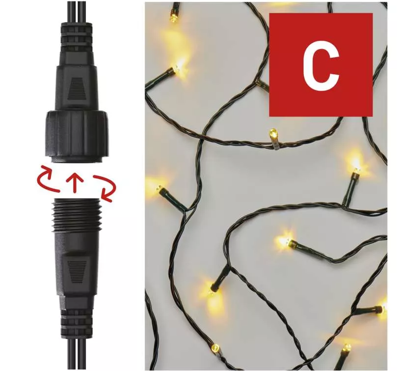 Propojovací systém CONNECT SYSTEM STANDARD je díky stupni krytí IP44 vhodnýk vnitřnímu i venkovnímu použití, avšak pouze v sezónu, nikoliv po celý rok. Výhodou tohoto spojovacího systému ješiroká nabídka LED světelných prvků(C) v několika různých barvách. Ačkoliv je nejpopulárnějším vánočním osvětlením řetěz, ve spojovacím systému můžete vybírat podle vlastních designových preferencí z krápníků, záclon, sítí nebo hvězd na špičku vánočního stromu. Z jedinéhonapájecího zdroje(A) připojeného kprodlužovacím kabelům, rozbočovačům(B) asvětelným LED prvkům(C) je možné napájet až 800 LED světýlek.